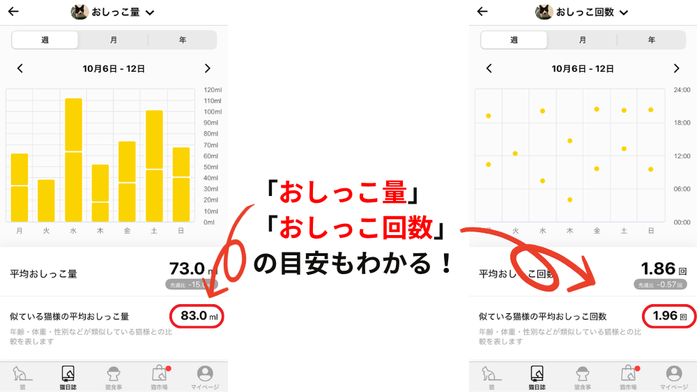 Catlog Board2では「おしっこ回数」と「おしっこ量」が自動記録され、アプリで管理することができます。