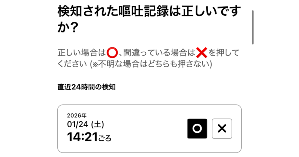 公式サイトには「通知が届く」とありますが、ご自身でアプリを開いて嘔吐の有無を確認する必要があるという点には注意しましょう。