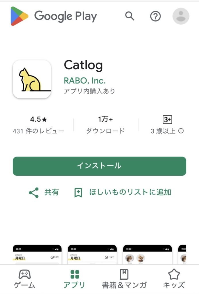 iPhoneの場合はApp store、AndroidのGoogle Playストアアプリで「Catlog」と検索してアプリをダウンロードします。
